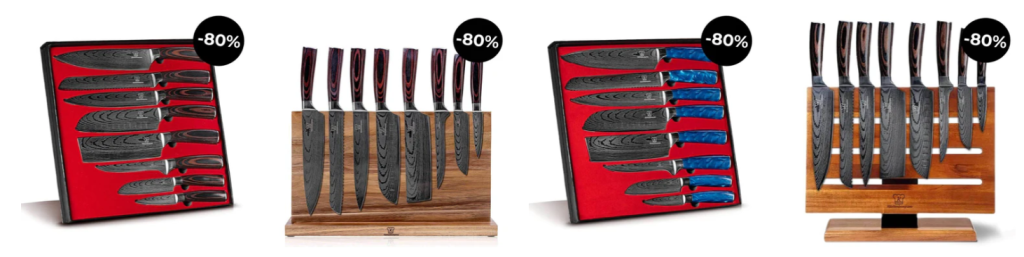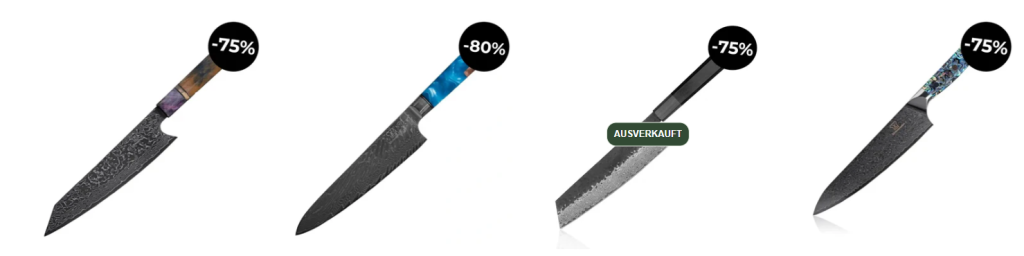 Damit richtet sich das Angebot sowohl an Nutzer, die gezielt ein einzelnes Messer suchen, als auch an Käufer, die ihre Küche gleich mit einem kompletten Set ausstatten wollen. Die übersichtliche Darstellung erleichtert die Entscheidung, welches Messer oder Set passend ist.